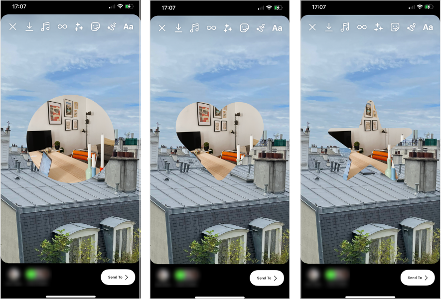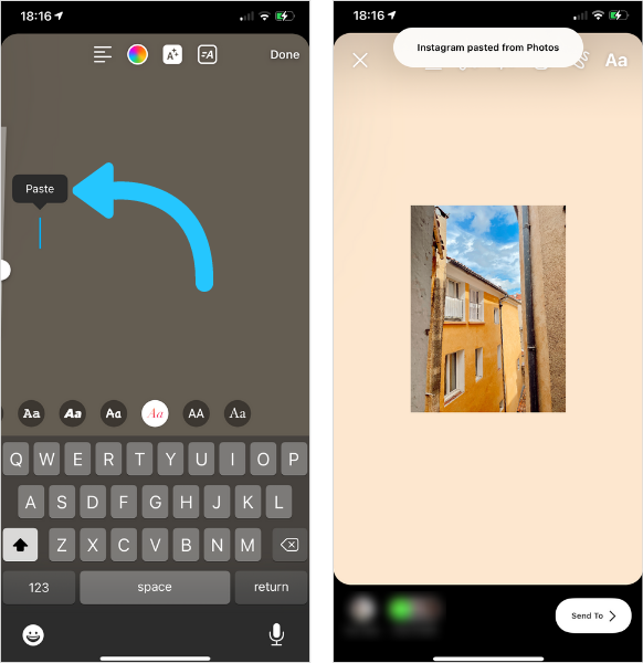 화면을 두 번 탭하면 "붙여넣기" 옵션이 표시됩니다. 이렇게하면 이전에 복사한 사진이 스토리에 나타나게 됩니다. 이 과정을 반복하면 원하는 만큼 사진을 추가할 수 있습니다.