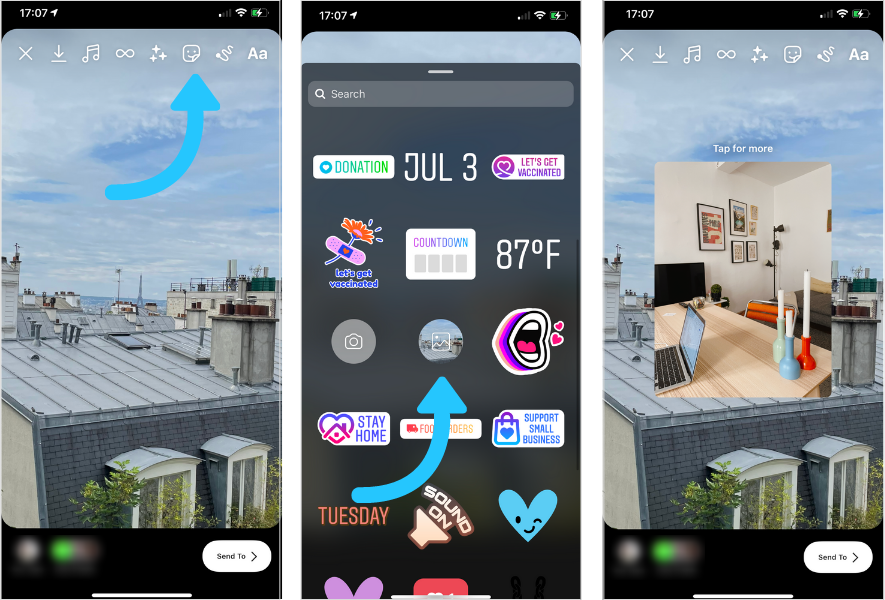 스토리에서 스티커 트레이를 누르세요. 그 후 카메라롤에서 사진을 선택하고 크기를 변경한 다음 원하는 곳에 배치합니다.