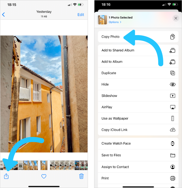 카메라롤에서 사진을 열고 "내보내기" 버튼을 눌러 시작합니다. 이제 "복사"를 탭하고 인스타그램 스토리로 이동하세요.