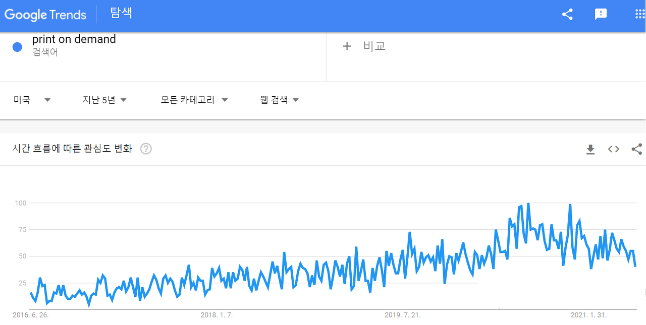 ↓지난 5년간 미국의 POD에대한 관심도 변화 및 성장 그래프