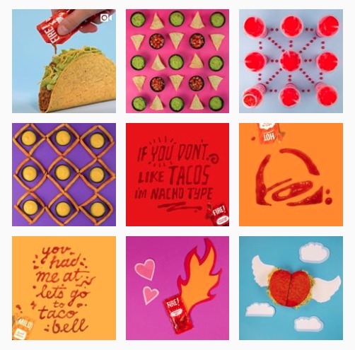 "Taco Bell"은 콘텐츠 전략을 위해 매우 강력한 그래픽 요소를 사용하는 업체입니다. 그들은 밝은 색상, 음식이 담긴 그래픽 이미지 및 많은 일러스트레이션을 사용하고 있습니다. 그들의 음식샷과 레이아웃조차 기하학적 패턴으로 배열되어 있으며, 피드내 모든 음식 이미지에서 이 패턴을 유지하고 있습니다.