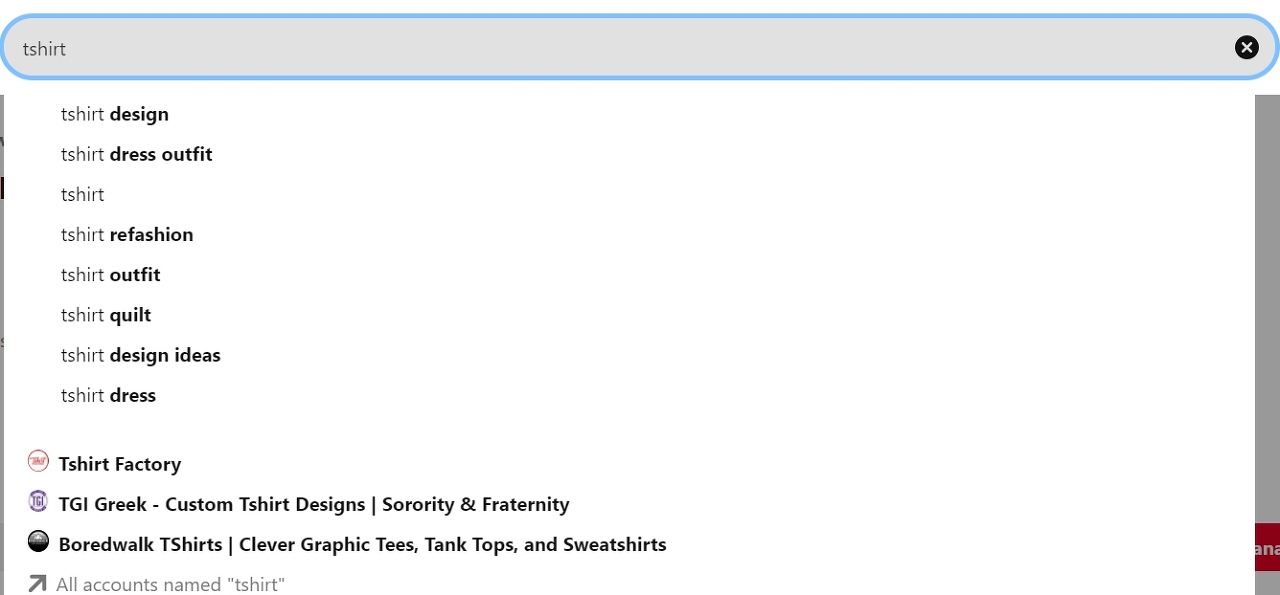 먼저, 검색창에 가장 일반적이고 직관적인 검색어를 입력해보세요. 예를들어 자신이 디자인한 POD 티셔츠핀을 게재하려고하는 경우 "tshirt"를 가장 먼저 검색해보시는 겁니다. 그러면 하단과같이 핀터레스트에서 가장 많이 검색 데이터를 보유하고 있는 자동완성되는 키워드들을 모아서 보여주는 것을 확인하실 수 있습니다.