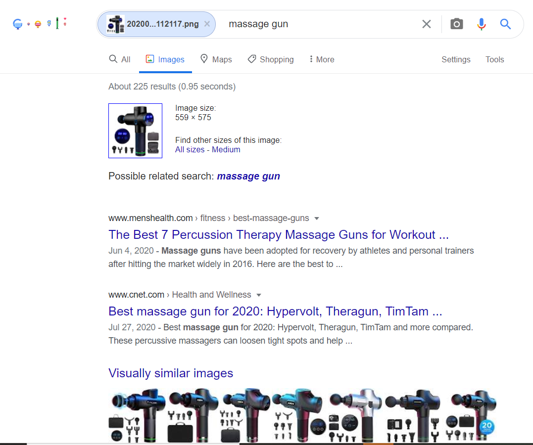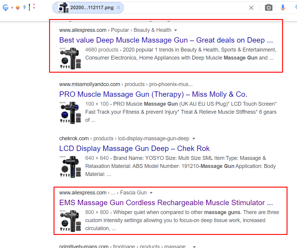 이렇게 상품이미지를 업로드시키면 구글에서 그 이미지가 있는 모든 사이트와 위치를 파악해서 결과물로 보여주게 됩니다. 제가 예시로 넣은 마사지건의 경우 구글에서 다양한 사이트에서 판매된다는 게 확인되었고, 같은 플랫폼 그러니까 알리익스프레스 자체에서도 판매하는 곳이 여러군데인걸 보면 이걸 판매했던 공급처는 제조사가 아니었다는 것을 확인/판단할 수 있습니다.